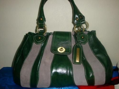 หนังสีเขียวผสมหนังกลับสีเทาปากกระเป๋าเปิดปิดด้วยกระดุมแป๊ก
