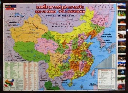 ** ขายแผนที่ประเทศจีน (China Maps) แสดงเป็น 3 ภาษา (ไทย/อังกฤษ/จีน) ลักษณะเด่น : 1) แสดงเมืองสำคัญ หัวเมือง มณฑลต่างๆ โดยแบ่งแยกสีชัดเจน ง่ายต่อการศึกษา