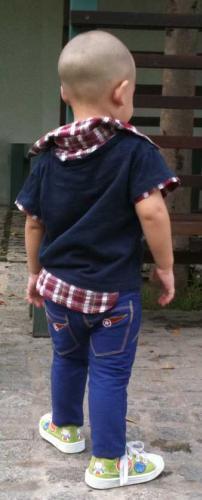เป็นเนื้อผ้ายีนส์แบบผู้ใหญ่ เนื้อผ้าไม่ได้ยืดค่ะ แต่น้องก็ใส่ได้สบายเพราะว่าผ้าไม่ได้หนา