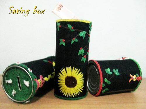 กระปุกออมสิน หุ้มด้วยผ้ายีนส์ตกแต่งด้านบนและด้านข้างด้วยดินหอมมะลิ