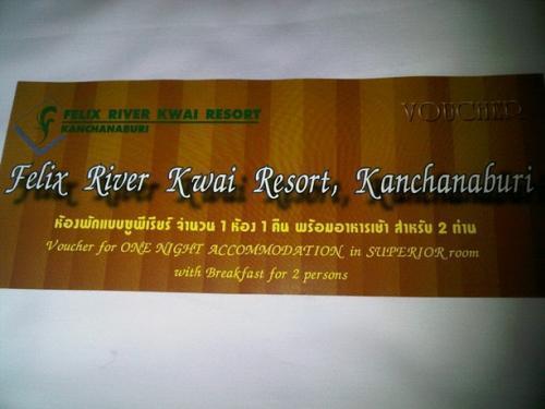 ผมมีบัตรห้องพักแบบซูพีเรียร์ จำนวน 1 ห้อง 1 คืน พร้อมอาหารเช้าสำหรับ 2 ท่าน-ของโรงแรม Felix River Kwai จ.กาญจนบุรี