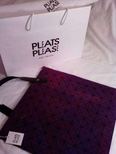 กระเป๋าขนาด 10x10 บล๊อก รุ่นใหม่ ทำจากผ้ากำมะหยี่ สีม่วงเหลือบๆ สวยเมื่อโดนแสงค่ะ ^_^ เพิ่งซื้อมาจาก Pleat Please Shop ที่ญี่ปุ่นสดๆร้อนๆ ของจะถึงเมืองไทยวันที่ 28 ตุลาคม 2010 นี้นะคะ มีถุงกระดาษสา พร้อมถุงกระดาษร้าน Pleat Please ให้พร้อม ! รูปถ่ายอาจจะไม่สวยแจ่ม เพราะใช้กล้องมือถือถ่ายแก้ขัดไปก่อน :P แต่ของจิงสวย ไฮโซ รับรองค่ะ ^_<