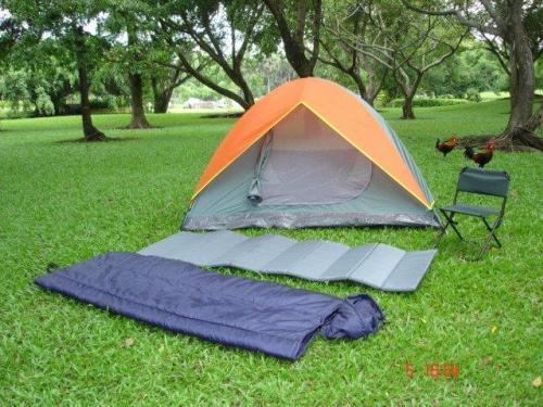 มีเต็นท์พักแรมเป็นชุดเดินทางขนาด 2-3 คน ( เต็นท์โดมสีเทาม่วง,แผ่นรองรองนอน,ถุงนอน,เก้าอี้สนาม,กระเป๋าใส่สีดำ)ราคาพิเศษ