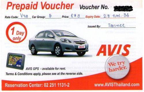 - คูปองนี้สำหรับวันจันทร์-พฤหัส ไม่ต้องเสียอะไรเพิ่มแล้ว จองรถกับ call center และยื่น voucher ให้พนักงานเมื่อรับรถที่สาขา avis ได้ทันที