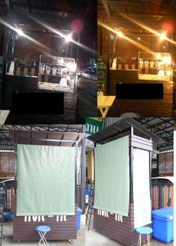มีหลังคาโพลีสีชาสวยงาม เป็นหลังคาสไตร์โมเดิร์น เก๋ๆ ตัวร้านเป็นโครงเหล็กแข็งแรงแต่น้ำหนักเบาเข็นขยับสะดวก