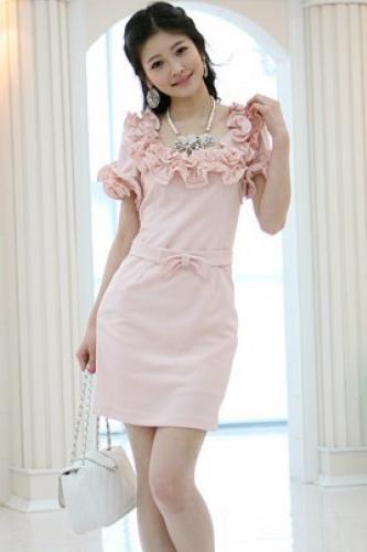เดรสตัดต่อ ตัวเสื้อผ้าลูกไม้สีขาวตัดต่อกับผ้าฝ้ายด้านหลังแต่งตัว กระโปรงผ้าฝ้ายเนื้อดีสีชมพูป้ายข้างหน้าผูกโบว์ที่เอว น่ารักสุด ๆ