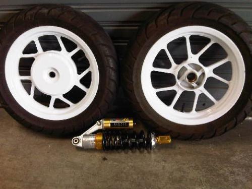 ขายล้อแมกซ์มอไซค์สีขาวพร้อมยางตัน+โช้คแกสซี่ มือ2 สภาพดี ราคา 6,700 บาท