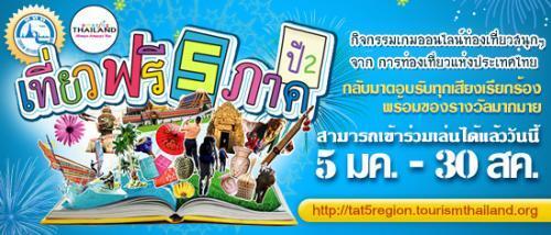 เที่ยวฟรี 5 ภาค ปี 2 เป็นกิจกรรมออนไลน์เพื่อกระตุ้นการท่องเที่ยวภายในประเทศสำหรับนักท่อง เที่ยวและประชาชนผู้สนใจที่เข้าเยี่ยมชมเว็บไซต์ http://www.ToursimThailand.org กิจกรรมนี้เริ่มตั้งแต่ วันที่ 1 มกราคม 2554 - 31 สิงหาคม 2554 โดยนักท่องเที่ยวและประชาชนผู้สนใจสามารถเข้าร่วมสนุกเล่นเกมส์เกี่ยวกับการ ท่องเที่ยวซึ่งจะประกอบไปด้วย Mini Game ท่องเที่ยว 5 เกมส์ พร้อมรับสิทธิ์ร่วมลุ้นของรางวัลในเดือนนั้นๆ โดยของรางวัลสนับสนุนโดยสถานประกอบการที่ได้รับการคัดเลือกจำนวนภาคละ 5 แห่ง
