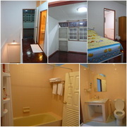พื้นห้องน้ำเป็นกระเบื้อง มีอ่างอาบน้ำพร้อมเครื่องทำน้ำอุ่น โถสุขภัณฑ์ใหม่ทั้งชุด