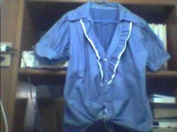 เป็นเสื้อ คอวี แขนสั้น สีฟ้า ติดกระดุม สม็อคหลัง แขนโป่งน่ารักมาเลยคะ