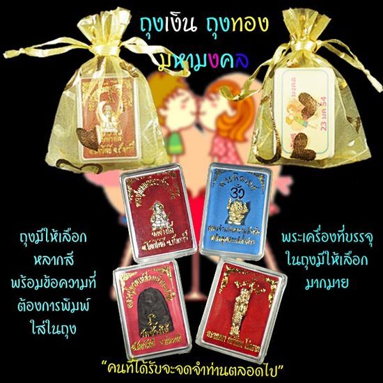 ของชำร่วย ของที่ระลึก ชุดถุงเงินถุงทอง มหามงคล เป็นวัตถุมงคล บรรจุในถุงสวยงาม ลายรูปหัวใจ มีสีให้เลือกหลากหลาย พร้อมข้อความที่ต้องการพิมพ์ใส่ สำหรับแจก งานมงคล เช่น งานแต่งงาน ((คนที่ได้รับจะจดจำท่านตลอดไป)) รายละเอียดหากต้องการเพิ่มเติมคุยกันได้ครับ ซื้อจำนวนมากราคาไม่แพงครับ จำนวนไม่มากเราก็ยินดีจัดทำให้ครับ ราคา 20-25 บาท ต่อ ชิ้น สนใจโทร 0860172590