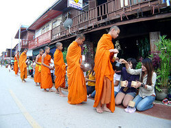 06.00 น . ตื่นเช้าสัมผัสอากาศของหลวงพระบางได้ยินระฆังกังวาลไปทั่วเมืองสัญญาณบุญ นำท่านไปร่วม ทำบุญตักบาตรข้าวเหนียว แด่พระสงฆ์จำนวนเป็นร้อยๆรูปเดินเรียงรายอยู่บริเวณกลางเมือง