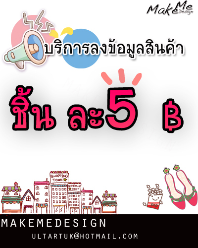 บริการรับลงสินค้า แค่ ชิ้นละ 5 บาทเท่านั้น ยิ่งสินค้าเยอะราคายิ่งลดจ้าาาาา บริการรับลงสินค้า ให้กับ เว็บสำเร็จรูป ร้านค้าออนไลน์ทั้งหลาย บริการรับลงสินค้า รวดเร็วทันใจ บริการออกแบบ logo+banner เว็บสำเร็จรูป ราคา 300บาท บริการออกแบบ banner สำหรับโฆษณาเว็บอื่นๆ บริการ ออกแบบหน้าเพจต่างๆ หน้าหละ 200 บาท บริการใส่ลายน้ำภาพสินค้า+ปรับแสง ภาพละ 3 บาทค่ะ บริการ รับดูแลจัดการเว็บ ร้านค้า ออนไลน์ ราคาแล้วแต่รายละเอียด ดูรายละเอียดเพิ่มเติมได้ที่ http://makemedesign.lnwshop.com หรือติดต่อสอบถามได้ที่ MSN and e-mail : [email protected]
