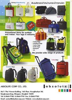 ‘’บริษัท แอบโซลูท คอร์ป จำกัด .. สวัสดีคะ ’’ เรารับผลิตกระเป๋าทุกๆชนิด อาทิเช่น กระเป๋าถือ กระเป๋าเอกสาร กระเป๋าโน๊ตบุ๊ค กระเป๋าผ้าลดโลกร้อน กระเป๋าเดินทาง กระเป๋าเป้ กระเป๋าสะพายข้าง กระเป๋าช็อปปิ้ง กระเป๋าล้อลาก กระเป๋ากีฬา กระเป๋าเก็บความเย็น กระเป๋าสตางค์ กระเป๋าปืน กระเป๋าพลาสติก กระเป๋านักเรียน กระเป๋าคาดเอว กระเป๋าเอนกประสงค์ กระเป๋าใส่รองเท้า กระเป๋าโน๊ตบุ๊ค กระเป๋าเครื่องสำอางค์ กระเป๋าพลาสปอร์ต กระเป๋าจุกจิก กระเป๋าหูรูด กระเป๋าหนัง กระเป๋าผ้าดิบ กระเป๋าใส่เหรียญ กระเป๋ายา กระเป๋าอูคูเลเล่ รวมถึง ออร์แกไนเซอร์ แฟ้มหนังเจาะห่วง ฯลฯ แกะแบบสั่งทำตามที่ลูกค้าต้องการ ทั้งงานเย็บจักร งานช็อต และงานกาว