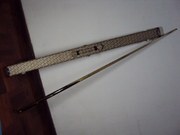 เป็นคิวเก่าประมาณ 4 ปี ไม้หน้าแกร่งมาก ลายไม้ชวยมากครับ ด้านหน้าไม้มี 4 ศร ด้านหลัง 2ศร ด้านข้างลายตรงมากไม่มีตาไม้ Spring Action ดีครับ ขายพร้อมกล่องPVC ลาย FENDI และอุปกรณ์ตัวต่อสไลด์ + ต่อด้ามของ O Min+ ซองใส่ชอล์กของ Master Cue (เคยเป็นสีขาวล้วนแต่ตอนนี้สีเขียวนำหละ ) และแถมชอล์กเน่าๆให้อีกหนึ่งอัน 555 ( คำๆนะครับ :P )