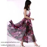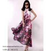 เสื้อผ้าแฟชั่นนำเข้า : maxi dress เดรสยาว ใส่เที่ยว ใส่ทำงาน แขนกุด คอรูด ตัวกระโปรงบานยาว พื้นสีขาวลายดอกไม้สีม่วง ใส่ออกงาน