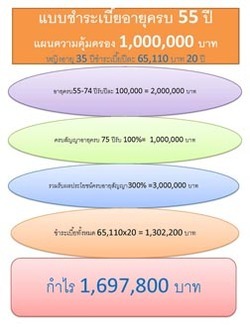 <img src="http://www.muangthailifetime.com/data/muangthaihappy.com/images/111111111.jpg" alt="แบบ 55 ชำระเบี้ย 20 ปี กำไร 1,697,800 บาท">