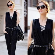 ชุด Jumpsuit กางเกงขายาวเกาหลี แขนกุด ผ้าลื่นๆเนื้อดี คอ V จั้มรอบเอว แต่งกระเป๋าข้าง สีดำ (Size: M/L)