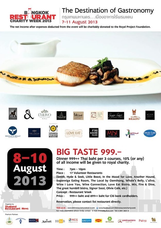 กรุงเทพมหานคร...เมืองอาหารไร้พรหมแดน งานเทศกาลอาหารครั้งแรกของประเทศไทย ที่รวมร้านอาหารระดับชั้นนำในกรุงเทพฯกว่า 17 ร้าน มาจัดรายการพิเศษ BIG TASTE เซ็ทเมนูสุดหรูโดยฝีมือเชฟระดับชั้นแนวหน้าของประเทศไทย และเชฟระดับมิชลินสตาร์ มาให้ท่านได้ลิ้มลองในราคาเพียง 999++ ระหว่างวันที่ 8-11 สิงหาคม 2556 นี้ โดยรายได้จากการจำหน่ายหลังหักค่าใช้จ่ายทั้งหมด จะมอบให้มูลนิธิโครงการหลวง ติดต่อสอบถามรายละเอียดที่ โทร. 02 991-3031-3 หรือที่ www.bkkrestaurantweek2013.com และ www.facebook.com/bkkrestaurantcharityweek