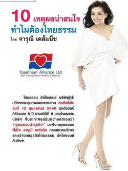 10 เหตุผลน่าสนใจ ทำไมต้องไทยธรรม ไทยธรรม อัลไลแอนซ์ บริษัทผู้นำนวัตกรรมสุขภาพและความงาม ก่อตั้งขึ้นในวันที่ 12 กุมภาพันธ์ 2548 บริษัท ไทยธรรม ประกาศจุดยืนชัดเจนว่า "คุณธรรมนำธุรกิจ" มาฟัง 10 เหตุผลน่าสนใจ ทำไมต้องไทยธรรม จาก คุณ เปิ้ล จารุณี เดส์แน็ซ กรรมการบริหาร และเจ้าของธุรกิจไทยธรรม อัลไลแอนซ์ เหตุผลที่ 1 : เพราะไทยธรรมเป็นหนึ่งใน 13 บริษัทนวัตกรรมยอดเยี่ยมด้านผลิตภัณฑ์ เพื่อสุขภาพแห่งชาติประจำปี 2012 คัดเลือกโดยสำนักงานนวัตกรรมแห่งชาติ กระทรวงวิทยาศาสตร์ และเทคโนโลยี เหตุผลที่ 2 : เพราะไทยธรรมก่อตั้งมูลนิธิ "ไทยคุณธรรม" คืนกลับส่วนหนึ่งของกำไรสู่แผ่นดินเกิด เหตุผลที่ 3 : เพราะผลิตภัณฑ์ของไทยธรรม เห็นผลเร็ว เห็นผลชัดและวัดผลได้ เหตุผลที่ 4 : เพราะไทยธรรมคัดสรรผลิตภัณฑ์ยอดเยี่ยมคุณภาพระดับโลกมาให้ คนไทยได้ใช้ เหตุผลที่ 5 : เพราะแผนการตลาดของไทยธรรมง่ายแสนง่าย และสร้างรายได้ได้จริง เหตผลที่ 6 : เพราะตำแหน่งทางการตลาด และรายได้จากไทยธรรมโอนเป็นมรดกได้ เหตุผลที่ 7 : เพราะไทยธรรมพัฒนาไม่หยุดยั้ง เหตุผลที่ 8 : เพราะไทยธรรมให้ความสำคัญกับสมาชิกทุกท่าน เหตุผลที่ 9 : เพราะธุรกิจไทยธรรมลงทุนต่ำ เหตุผลที่ 10 : ท่องเที่ยวทั่วโลกกับไทยธรรม