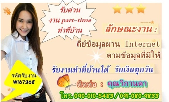 งานพาร์ทไทม์นักศึกษา ช่วงปิดเทอม ทำงานที่บ้าน อาชีพเสริมนอกเวลา เทำงานจ่ายเงินรายวัน งานสำหรับน้องๆที่มีเวลาว่าง เเล้วไม่รู้จะทำอะไรดี วันนี้รามีงานมาเเนะนำ สำหรับน้องๆที่ใช้คอมพิวเตอร์ อินเตอร์เน็ตเป็นประจำอยู่แแล้ว ดีกว่ามั้ยที่วันนี้เรามาสร้างรายได้จากการทำงานช่วงปิดเทอมอยู่กับบ้านกัน หากสนใจ งานพาร์ทไทม์นักศึกษา ติดต่อด่วนค่ะ