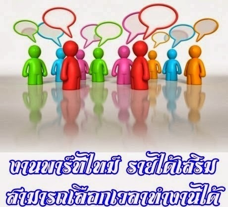 สำหรับผู้ต้องการหางานทำที่บ้าน Part time วันละ 2-3ชั่วโมง เป็นรายได้เสริมเสาร์-อาทิตย์ งานพิเศษ ระหว่างเรียน หลังเลิกเรียน หลังเลิกงาน งานพาร์ทไทม์ อาชีพเสริม รายได้ดี งานเสริม 2557/2014เหมาะกับ นักศึกษา คนทำงานประจำ คนว่างงาน ที่มีเวลาว่างๆ แค่เราใช้งาน Computer และ Internet ประจำๆ สามารถทำได้