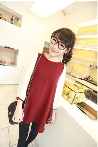 เดรสแขนยาวสีแดง ผ้าชีฟองเนื้อลื่น ตัดต่อสีขาว ไม่มีซับใน