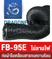 ท่อเฟล็กซ์อ่อนผ้าใบเคลือบสารทนความร้อน (FB-95E)สีดำ โครงลวดสปริง ชนิดไม่ลามไฟ ใช้กับระบบระบายอากาศ กำจัดควันพิษภายในอาคาร ท่อมีน้ำหนักเบา ต้านทานแรงกดดันต่ำ ยืดหดได้ด้วยโครงลวดสปริง ไม่เป็นพิษต่อสิ่งแวดล้อม และมีคุณสมบัติพิเศษ ไม่ลามไฟ ทนความร้อนในอุณหภูมิ -5 ถึง 100 องศา ใช้ได้ในโรงงานอุตสาหกรรมทั่วไป และ ครัวเรือน ร้านค้า ร้านอาหาร โรงพิมพ์อิงค์เจทที่ต้องการระบายความร้อนและกลิ่น และอุณหภูมิ