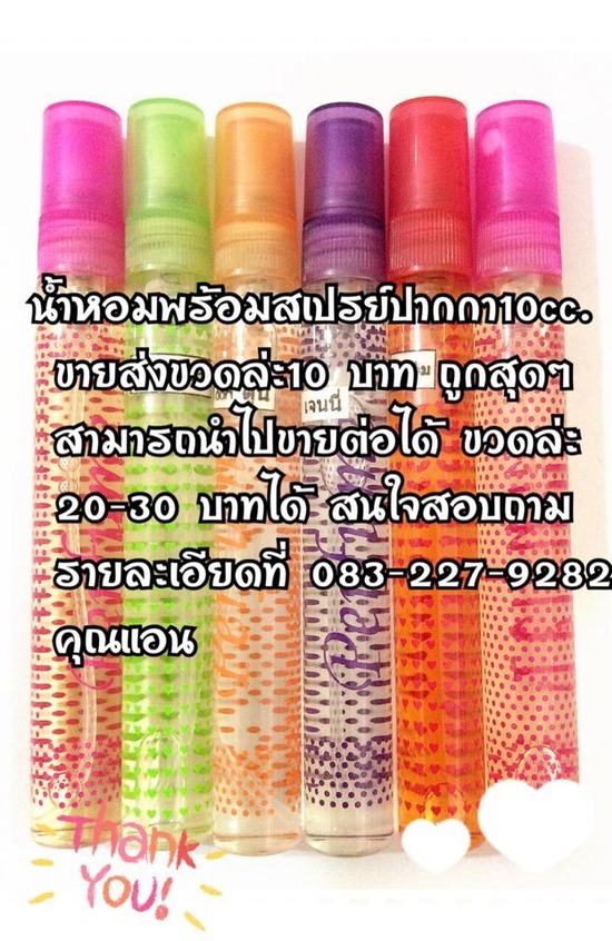 น้ำหอมพร้อมขวดขวดละ 10 บาท ขั้นต่ำ 10 กลิ่นขึ้นไป กลิ่นละ 1โหล ลงทุน 1200 บาท นำไปขายต่อ 20-25-30 บาท กำไรเห็นๆ โทร.083-227-9282 แอน ร้านน้ำหอมฟุ้ง https://www.facebook.com/lallaperfume www.foongshop.com Line:ivoryperfect