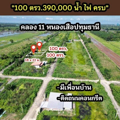 ที่ดินคลองสิบเอ็ด หนองเสือ ติดถนนคอนกรีต น้ำไฟหน้าแปลง ขนาด 100 ตรว. ราคา 390,000 บาท