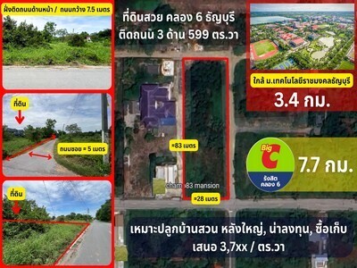 โอกาสทองมาแล้ว! ที่ดินสวยธัญบุรี หน้าที่สวยติดถนน 3 ด้าน! ขายที่ดินธัญบุรี รังสิต คลอง 6 เนื้อที่ 599 ตร.วา (พิเศษ 3,7xx บ/ตร.วา)