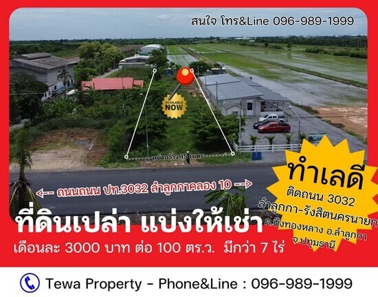 ให้เช่าที่ดินเปล่า แปลงสวย ทำเลดีมาก กว่า 7 ไร่ ติดถนนทางหลวง 3032 ลำลูกกา-ธัญบุรี คลอง 10