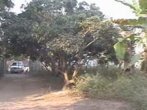 ที่ดินล้อมรั้วแล้ว-ด้านหน้าที่เป็นรั้วคอนกรีตสูง2เมตร ที่ถมแล้ว ในที่ดินมีต้นลำใย