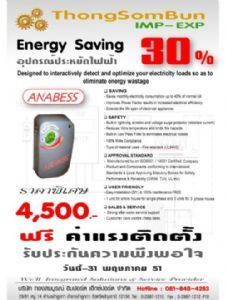 อุปกรณ์ประหยัดค่าไฟฟ้า ANABESS สามารถประหยัดค่าไฟฟ้าสูงสุด40% ติดตั้งง่าย เคลื่อนย้ายสะดวก ลดความร้อนในสายส่ง โดยไม่ลดแรงดันไฟฟ้า ปรับปรุงค่ากำลังไฟฟ้า (Power factor) ทำให้ระบบไฟฟ้าของท่านมีความเสถียรมากขึ้น ช่วยปรับปรุงแรงดันให้คงที่ ปรับปรุงการไหลของกระแสไฟฟ้า และช่วยแก้ปัญหาแรงดันตกปลายทาง ช่วยลดแรงดันกระชาก ระงับแรงดันเกินชั่วขณะที่เป็นอันตรายกับเครื่องใช้ไฟฟ้า ปรับปรุงคุณภาพของไฟฟ้าก่อนป้อนให้กับเครื่องใช้ไฟฟ้า เพื่อให้เครื่องใช้ไฟฟ้าทำงานอย่างมี ประสิทธิภาพมากขึ้น ลดการกระชากไฟฟ้า ช่วยยืดอายุการใช้งาน ลดค่าซ่อมบำรุงของอุปกรณ์ เครื่องใช้ไฟฟ้า