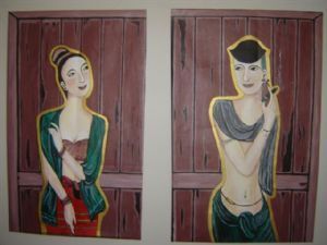 ภาพวาดสีอาคีริคบุรุษและสตรีในตำนานไทยบนผืนผ้าใบพร้อมติดกรอบไม้ให้เรียบร้อยแล้ว