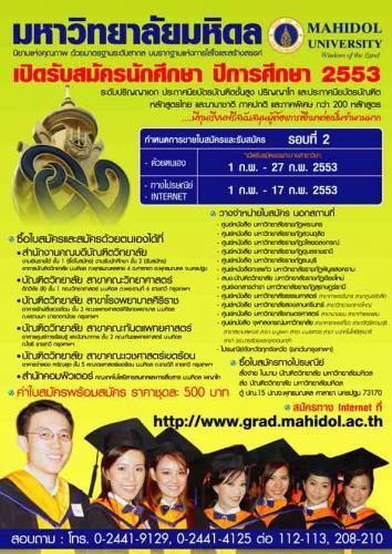 เปิดรับสมัครแล้ว!! สำหรับผู้สนใจเรียนต่อ โท เอก ที่มหิดลตั้งแต่วันที่ 1 27 ก.พ. 53นี้