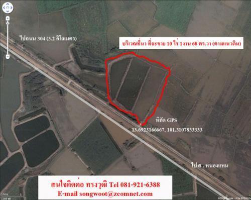 แปลง 10-1-68 ไร่ มีโฉนด ราึคาถูกที่สุดในย่านนี้(ที่มีคุณสมบัติไกล้เคียงกัน) ตกทอดมาจากสมัยรัชการที่ 5 ติดคลองชลประทาน และ ถนนลาดยาง (ด้านติดถนนและคลอง กว้าง 85เมตร) ราคาไร่ละ 350,000.- บ้านปลายกระจับ ต. หนองแหน อ. พนมสารคาม จ. ฉะเชิงเทรา (แปดริ้ว)