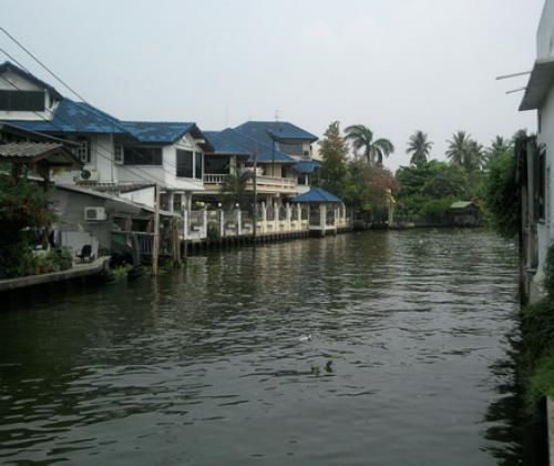 ด้านหนึ่งติดถนนเมนของหมู่บ้าน อีกด้านหนึ่งติดคลองนักท่องเที่ยว