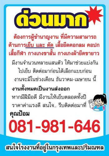 ต้องการผู้ชำนาญงาน ที่มีความสามารถด้านการเย็บ และ ตัด เสื้อผ้า..ด่วนมาก