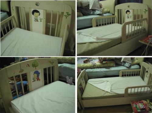 เตียงไม้ยางพาราขนาดประมาณ 70x135 ซม. (วัดขนาดฟูก) ไม่สูงมาก สำหรับเด็กประมาณ 3-5 ขวบ พร้อมบันไดขึ้นเตียงเข้าชุดกัน ฟูกด้านในเป็นเบาะยาง ทำความสะอาดได้ถ้าน้องปัสสาวะรดที่นอน (ไม่มีผ้าปูและหมอนนะคะ) ลายการ์ตูนเป็นสติกเกอร์ลอกออกได้ค่ะ เตียงสามารถถอดเก็บประกอบได้