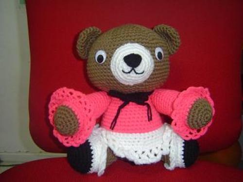 หมีถักโครเชต์ ความสูง 10นิ้ว ชุดสีชมพู กระโปรงสีขาว