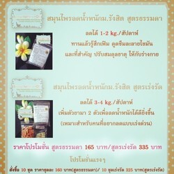 1.สมุนไพรลดความอ้วนสูตรธรรมดา ทานแล้วจะทำให้รู้สึกอิ่ม ลดการดูดซึมไขมัน ช่วยเร่งระบบเผาผลาญ ที่สำคัญเป็นสมุนไพรที่มีส่วนปรับสมดุลธาตุให้กับร่างกาย 1 ชุดทานได้ 1 อาทิตย์ จะสามารถลดน้ำหนักได้ 1-2 กิโล จะมีตัวยา 5 ตัว ( DU JG JP HW JL )ราคา165บาท
