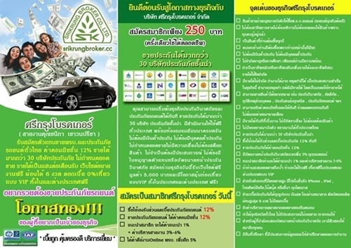 ยินดีต้อนรับสู่โอกาสทางธุรกิจกับบริษัทศรีกรุงโบรคเกอร์ จำกัด สมัครสมาชิกเพียง 250 บาท(ครั้งเดียวใช้ได้ตลอดชีพ) คุณสามารถเริ่มต้นธุรกิจ ประกันวินาศภัยและประกันภัยรถยนต์ได้ทันที ขายประกันได้มากกว่า 30 บริษัทประกันภัยชั้นนำ มีสำนักงานให้ใช้ฟรีทั่วประเทศ พร้อมห้องอมรมสัมมนาครบครัน ไม่ต้องมีเงินค้ำประกัน ไม่ต้องมีบุคคลค้ำประกัน ไม่กำหนดยอดขาย ไม่มีความเสี่ยง ไม่ต้องสต็อกสินค้า ไม่จำเป็นต้องมีประสบการณ์ ไม่ต้องมีใบอนุญาตตัวแทนหรือบัตรนายหน้าประกันวินาศภัย สมัครร่วมธุรกิจวันนี้ รับเว็บไซต์ฟรี มูลค่า 5,000 บาท และมีโอกาสลุ้นท่องเที่ยวแบบVIP ทั้งในประเทศและต่างประเทศ ฟรี!