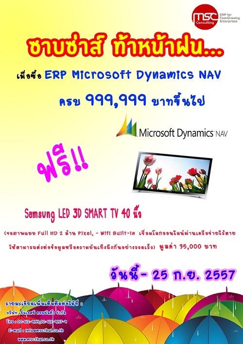 MSC Consulting Co.,Ltd จัดโปรโมชั่นสำหรับลูกค้าที่กำลังมองหาระบบ ERP เพื่อนำไปพัฒนาองค์กร ของ Microsoft Dynamics NAV สามารถช่วยในการวางแผนบริหารทรัพยากรภายใน ด้วยรูปแบบที่ครอบคลุมทางเทคโนโลยี กลยุทธ์ และกำหนดเป้าหมายทางการตลาดได้ทันที อย่าช้า !!!!โอกาสดีๆมาถึงแล้ว....เพียงแค่คุณซื้อ ERP Microsoft Dynamics NAV