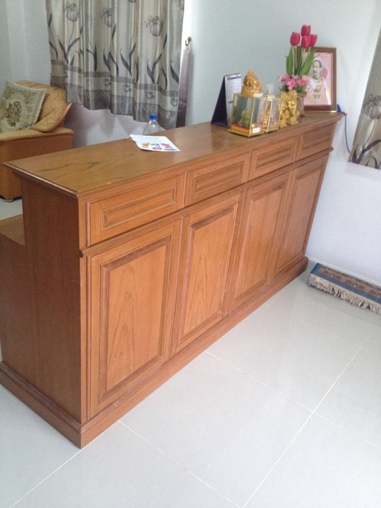 เป็นไม้สักแท้ๆ มีร้อย ขีดขวน นิดหน่อย สภาพก็85% ขนาด ผมกะๆเอานะ ประมาณไม่เกิน ยาว2.7เมตร กว้าง 60เซน มีลิ้นชัก 4ช่องพอดีผมติดธุระ ของอยู่อีกบ้าน เลยถ่ายมารูปเดียวแล้วไม่ได้ วัดขนาด แม่ฝากขาย ของอยู่ ที่ หมู่บ้านคุณาภัทร 5 ซ. วัดลาดปลาดุก ไทรน้อย