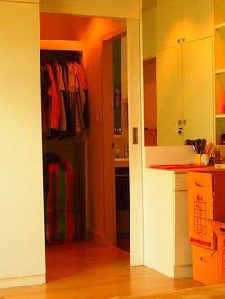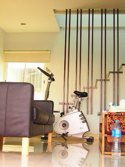 ห้องรับแขกแถมโซฟา และเครื่องออกกำลังกาย มีประตูกระจกบานใหญ่เปิดรับลมและแสงธรรมชาติช่วงกลางวันได้ดี หน้าต่างบานใหญ่ติดผ้าม่านไว้หมดทุกบาน