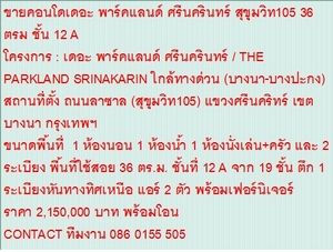 ขายคอนโดเดอะ พาร์คแลนด์ ศรีนครินทร์ สุขุุมวิท105 36 ตรม ชั้น 12 A