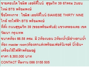 ชื่อโครงการ : ไซมิส เธอร์ตี้ไนน์ SIAMESE THIRTY NINE ใกล้ รถไฟฟ้า BTS พร้อมพงษ์