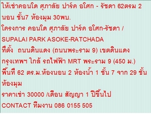 ให้เช่าคอนโด ศุภาลัย ปาร์ค อโศก - รัชดา 62ตรม 2 นอน ชั้น7 ห้องมุม 30พบ. / ให้เช่าคอนโด ศุภาลัย ปาร์ค อโศก - รัชดา 62ตรม 2 นอ