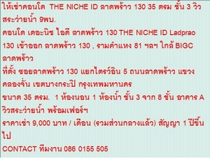 KEYWORD : RENT, Condominium, เช่าคอนโด, คอนโดให้เช่า, ให้เช่าคอนโด, ให้เช่าคอนโดมือสอง, ให้เช่าคอนโด สวย, ให้เช่าคอนโด ถูก ให้เช่าคอนโด เดอะนิช ไอดี ลาดพร้าว 130, Condo For RENT THE NICHE ID Ladprao 130 Condominium, ให้เช่า THE NICHE ID Ladprao 130 Condominium, ให้เช่าห้องชุด เดอะนิช ไอดี ลาดพร้าว 130, ให้เช่าคอนโด 1 ห้องนอน, ให้เช่าคอนโด 1 ห้องน้ำ, ให้เช่าคอนโด 1 ห้องนอน 1 ห้องน้ำ, ให้เช่าคอนโด กรุงเทพมหานคร, ให้เช่าคอนโด เขต/อำเภอ บางกระปิ, ให้เช่าคอนโด ตำบล/แขวง คลองจั่น, ให้เช่าคอนโด ถนน ลาดพร้าว, ให้เช่าคอนโด ซอย ลาดพร้าว 130, ให้เช่าคอนโด ใกล้กับ ลาดพร้าว 130 รามคำแหง 81 BIGC ลาดพร้าว , ให้เช่าคอนโด , ให้เช่าคอนโด วิวสระว่ายน้ำ
